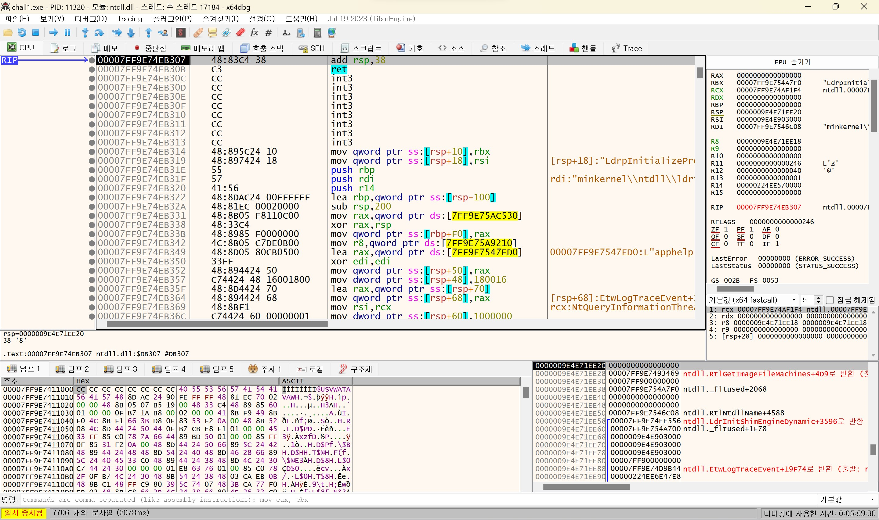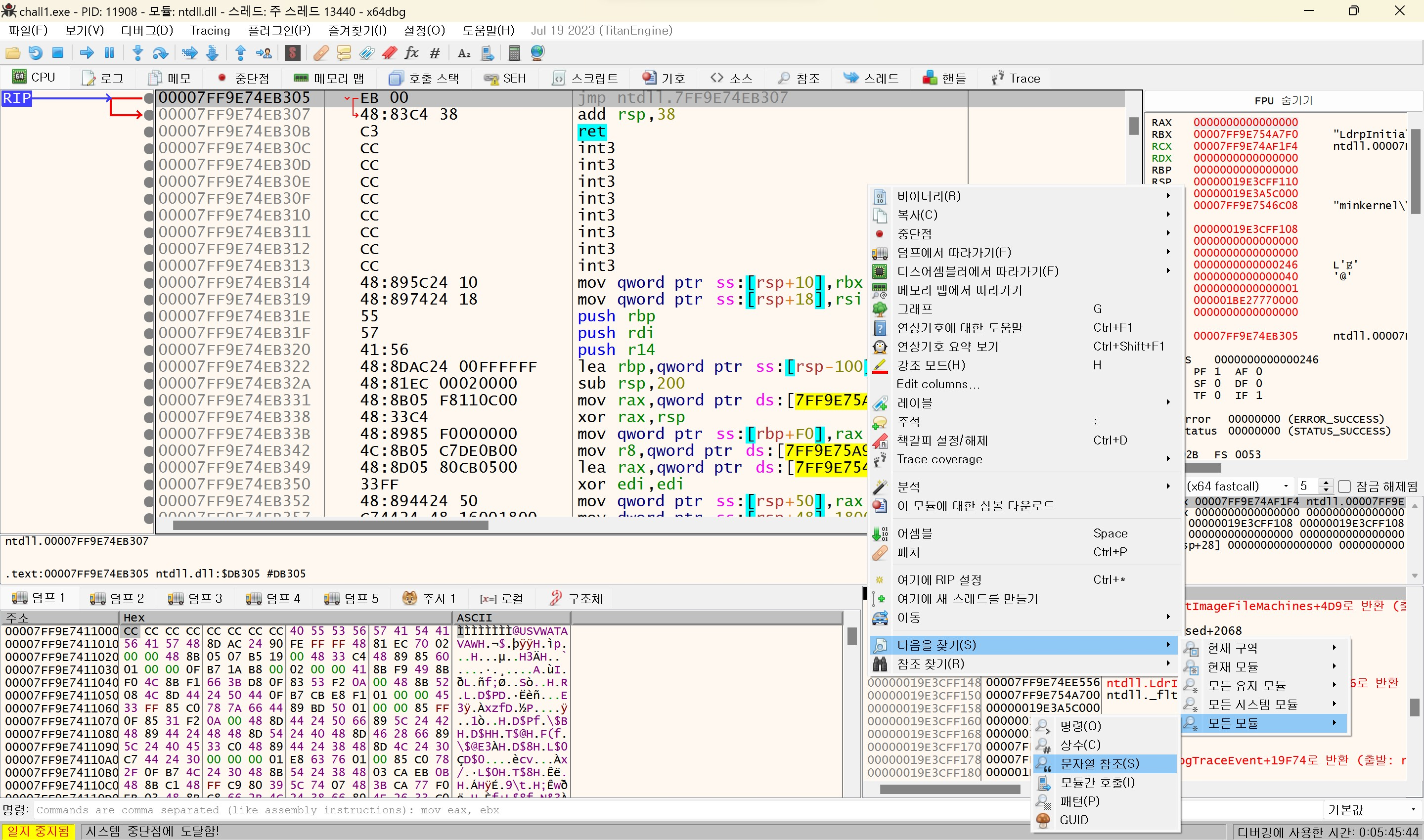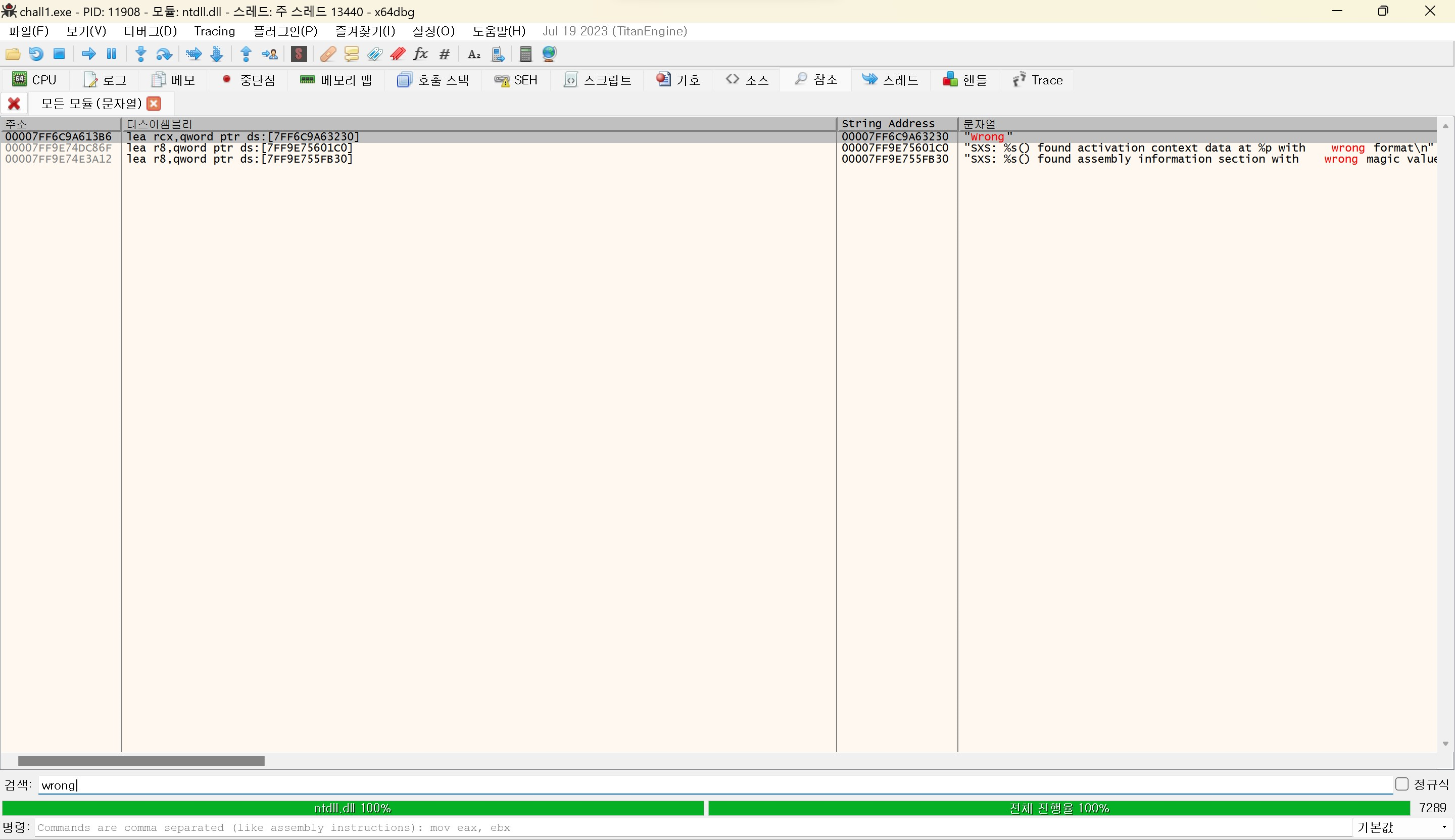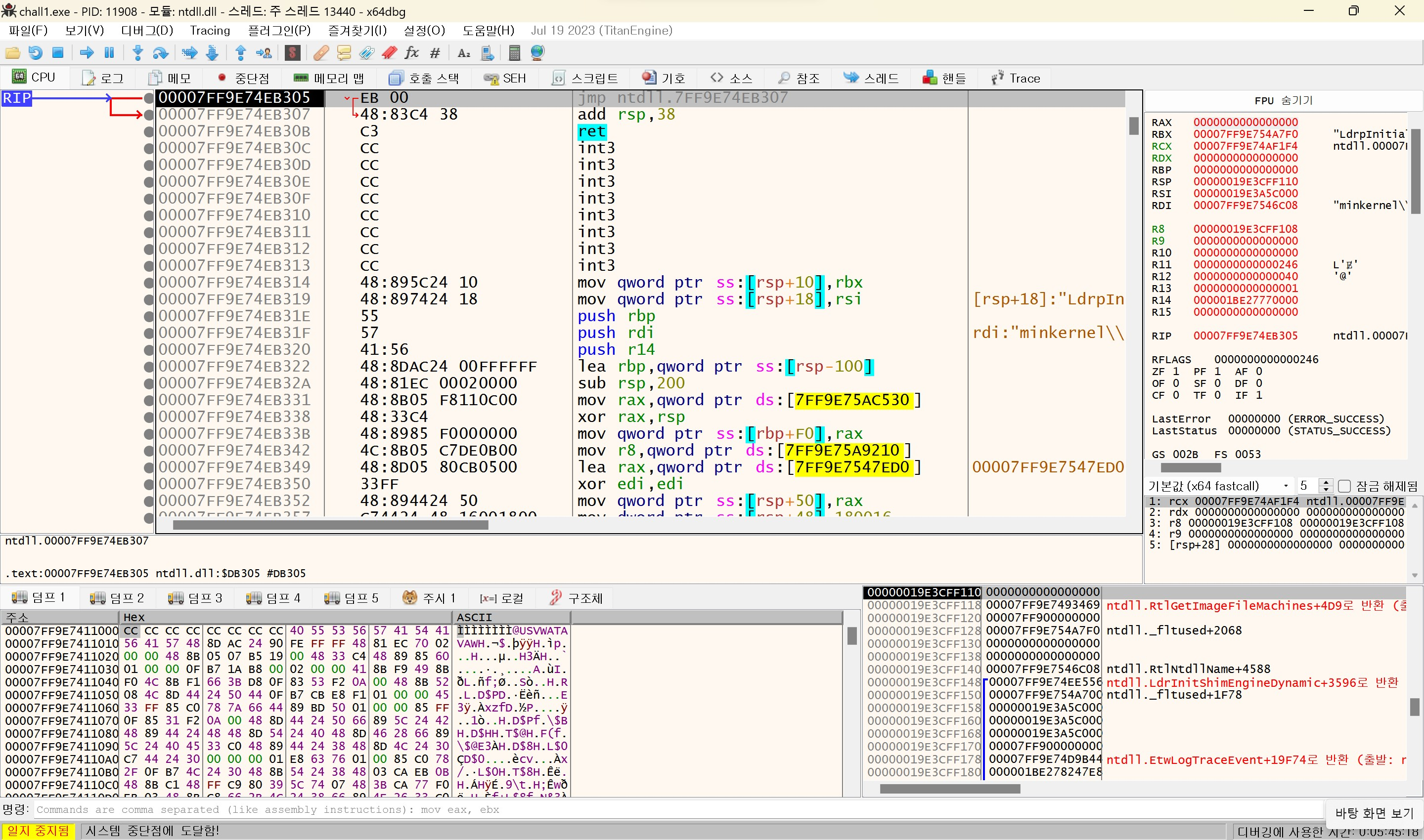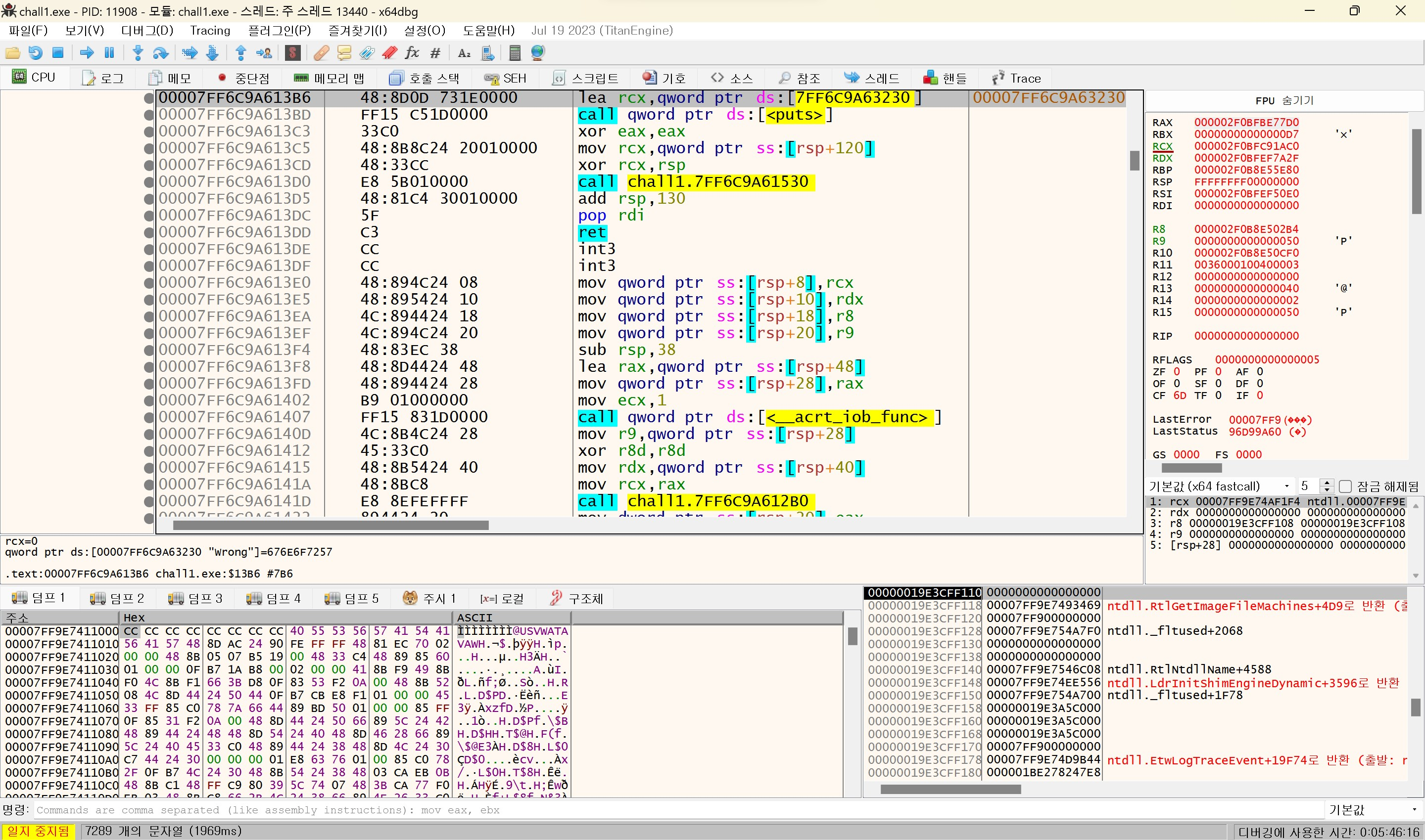 ๋ค์์ผ๋ก 'chall1.7FF6C9A61000' ํจ์๋ฅผ ํธ์ถํ๋ค. ์ด๋ค ํจ์์ธ์ง ์์ง ๋ชจ๋ฅธ๋ค.