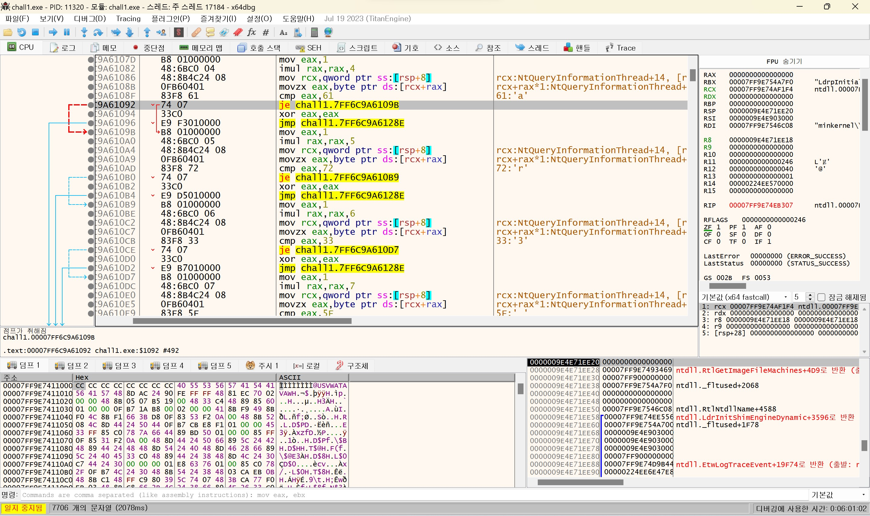je์ด๋ฏ๋ก ๊ฐ์ผ๋ฉด ๋ค์ ๋ฌธ์ ๋น๊ต ๋ถ๋ถ์ผ๋ก ๋์ด๊ฐ๊ณ , ๊ฐ์ง ์์ผ๋ฉด ๋ฐ๋ก ๋ฐ์ค์ธ xor eax eax ๋ถ๋ถ์ผ๋ก ๋์ด๊ฐ๋๋ฐ ์ด๋ ๊ฒ ๋๋ฉด call1.7FF6C9A612bE๋ฅผ ํธ์ถํ๋ค.