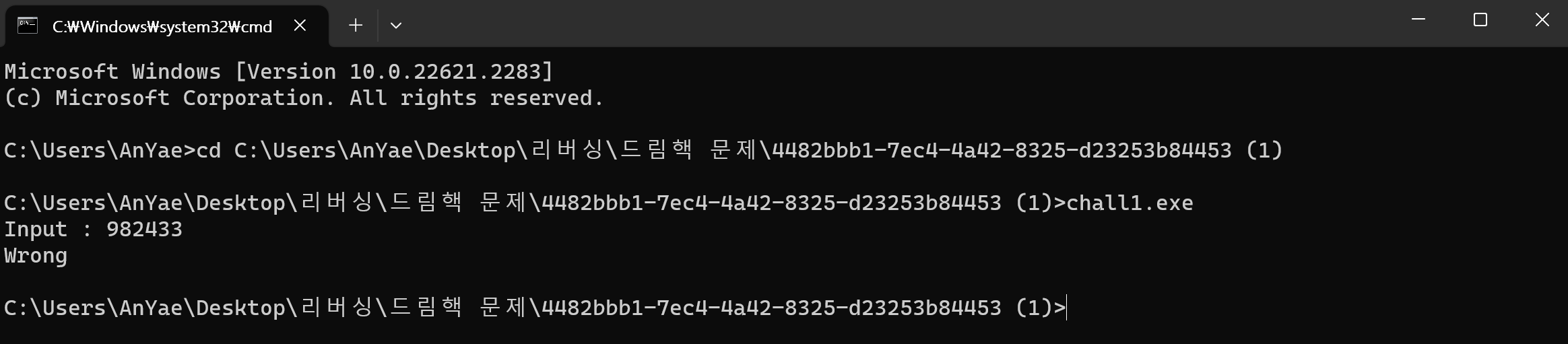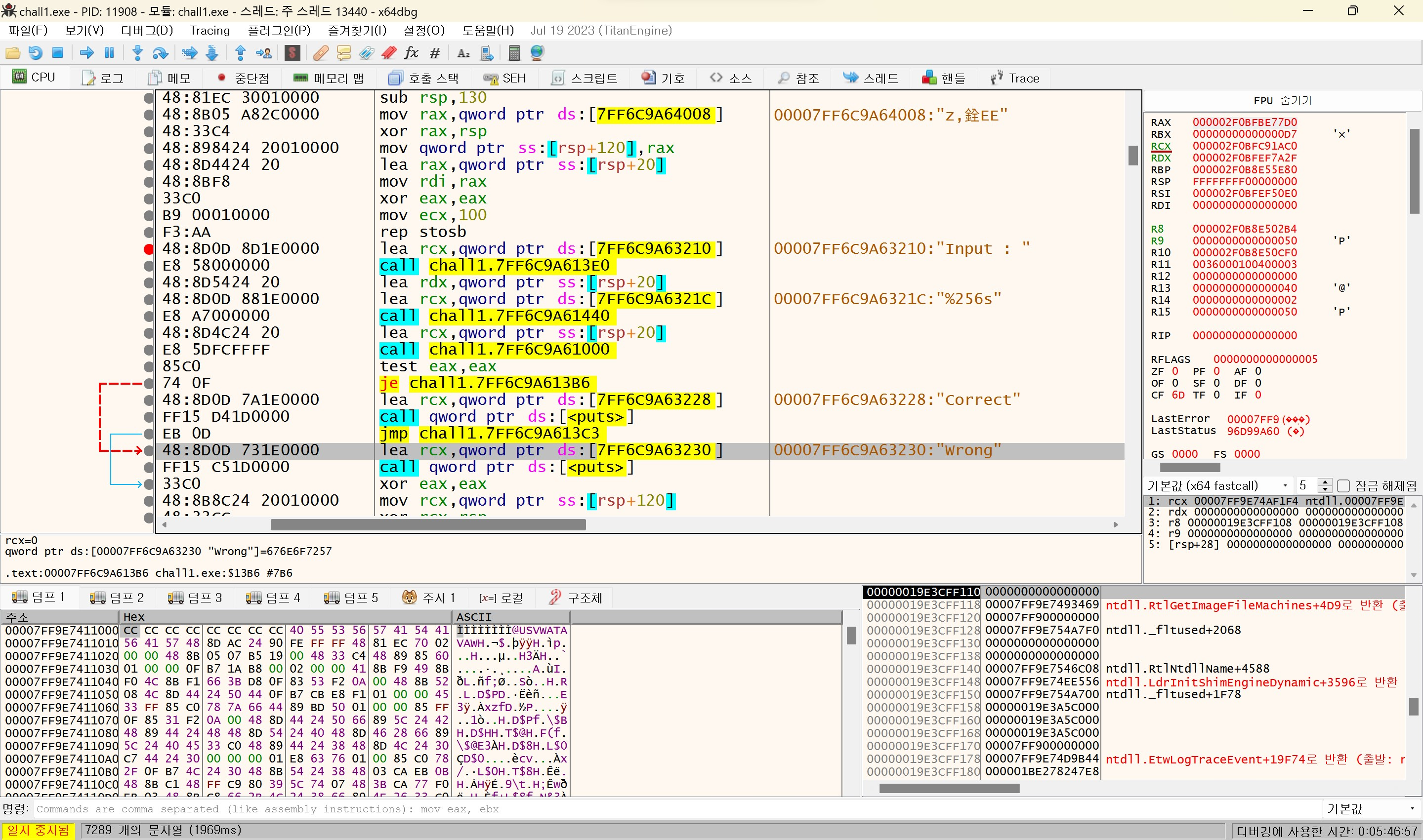 - 'call1.7FF6C9A612bE'๊ฐ ํธ์ถ๋์ด ๊ฒฐ์ ์ ํจ์๋ฅผ ๋๊ฐ ๋ ์ ํํ ์ด๋ป๊ฒ "Wrong" ์ถ๋ ฅ๊น์ง ์ด์ด์ง๋์ง ๊ตฌ์ฒด์ ๊ณผ์ ์ ์ ๋ชจ๋ฅด๊ฒ ๋ค.