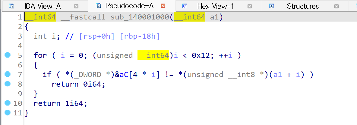IDA์ ๋ฃ๊ณ F5 ๋๋ฌ ์คํ์์ผ๋ณด๋ฉด ์์ ํ๋ฉด์ด ๋ธ.