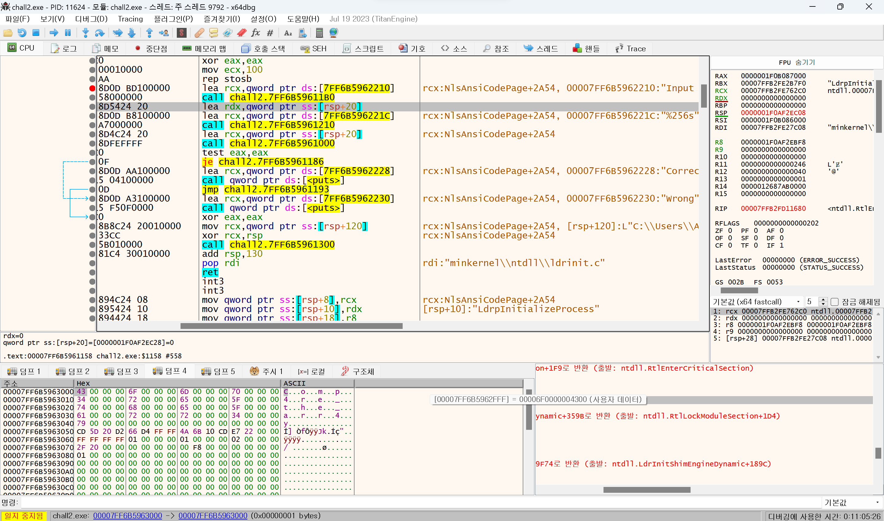 ๊ทธ๋ฌ๋ฉด ์ ๋๋๊น test eax eax ๋ง๋๊ธฐ ์ ์ ํจ์์ธ chall1.7FF6B5961000์์ ์น๋ถ๋ฅผ ๋ด์ผ ํ๋ค.