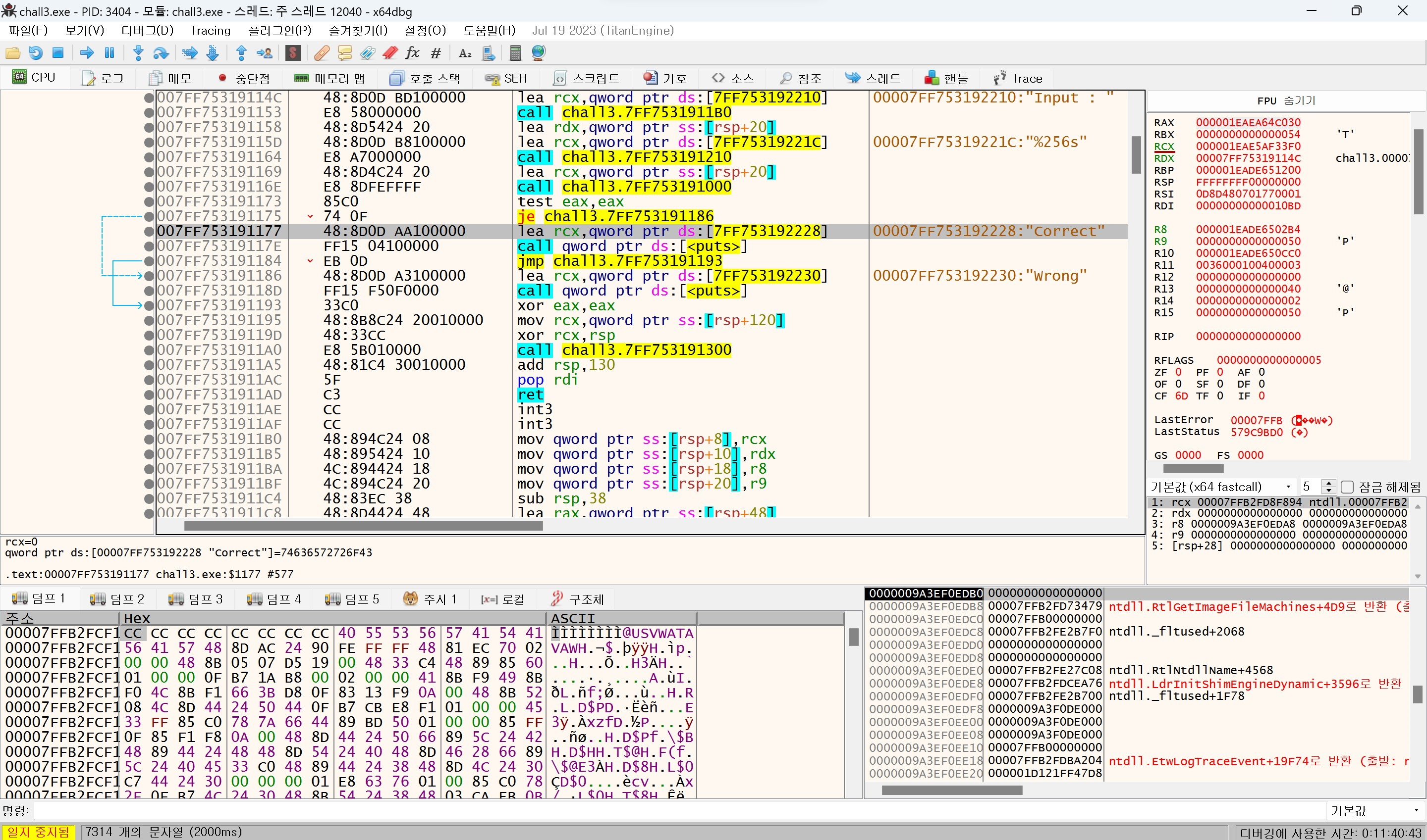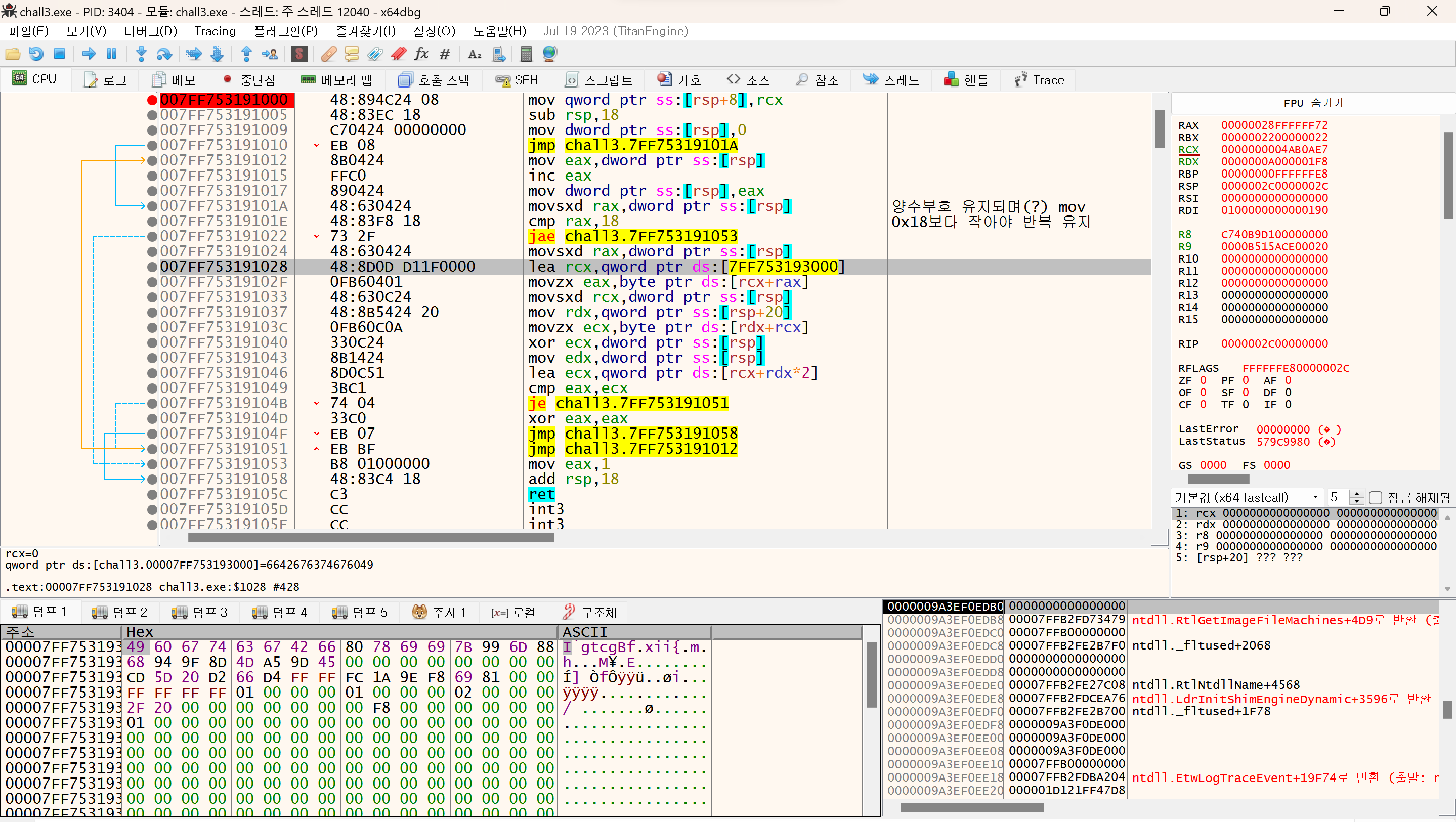 rcx์ ๋ค์ด๊ฐ 7FF753193000์ด๋ผ๋ ์ฃผ์์ ๋ญ๊ฐ ๋ค์ด๊ฐ ์๋์ง ๋ชจ๋ฅด๋ ๋คํ๋ก ๋ฐ๋ผ๊ฐ๋ณด์.